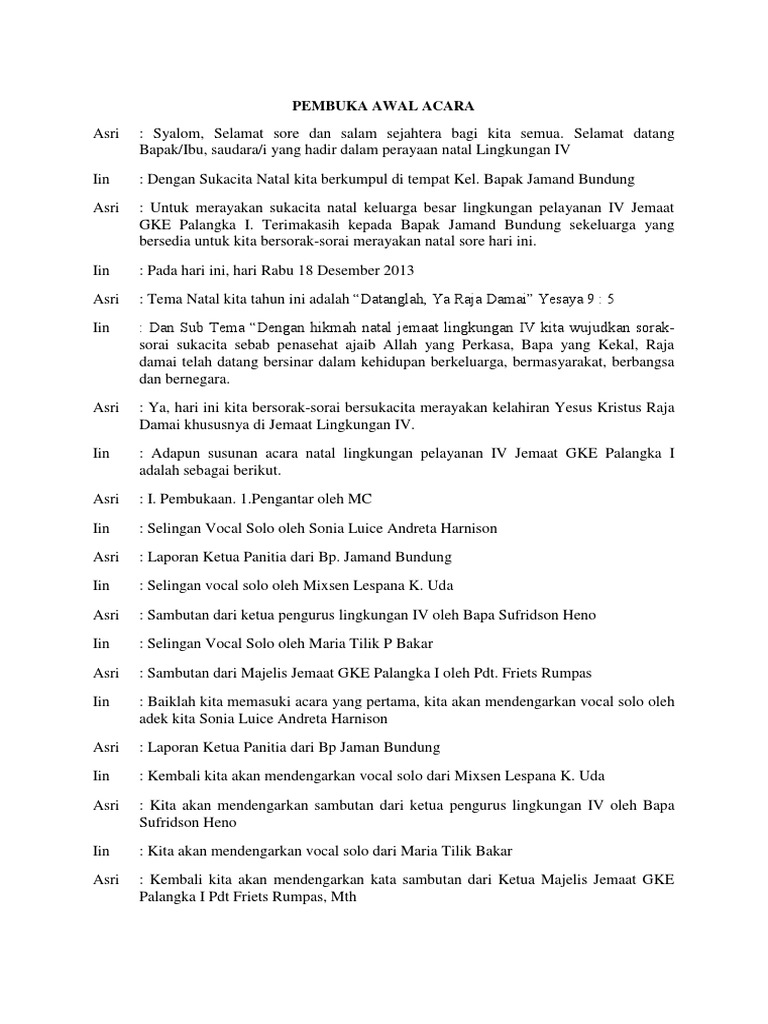 Mc untuk acara semi formal, kita harus tahu substansi acara jadi bisa dikembangkan. Contoh kata sambutan ketua panitia natal pemuda. Susun an acara syukuran natal dan tahun baru 2016 omk st.theresia perumnas simalingkar ritus contoh teks mc peringatan hari nasional 2 contoh teks mc assalaamu 'alaikum wr. Untuk itu kami persilahkan kepada bapak suryadi untuk memberikan sambutan. Susunan acara perayaan natal keluarga toraja.